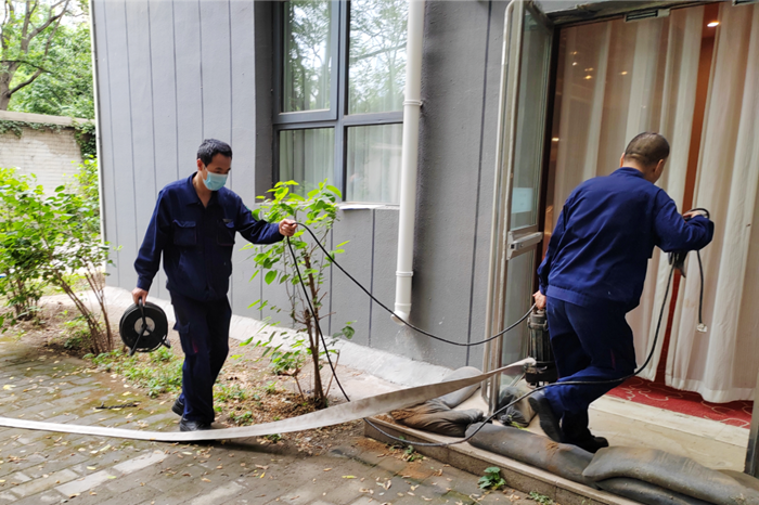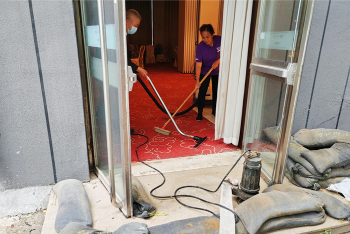 接到指令的工程部人員攜帶搶險(xiǎn)排澇設(shè)備:潛水泵、防水線軸、排水水帶趕到現(xiàn)場(chǎng),迅速開(kāi)展排澇搶險(xiǎn)工作;接到搶險(xiǎn)指令的客房部人員攜帶吸水機(jī)、舊布草、拖把隨即到達(dá)現(xiàn)場(chǎng),對(duì)室內(nèi)殘存的積水進(jìn)行了處理。最終,在參與搶險(xiǎn)的各部門(mén)人員的通力合作下,“內(nèi)澇險(xiǎn)情”得到了有效控制,保護(hù)了酒店財(cái)產(chǎn)不受損失。此次演練圓滿成功,達(dá)到了預(yù)期效果。