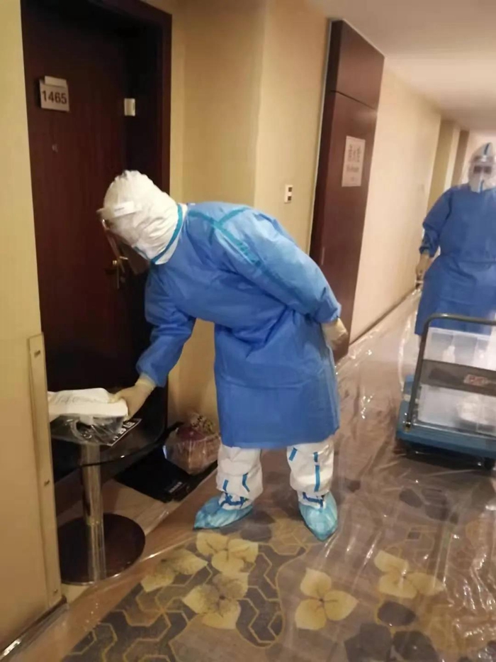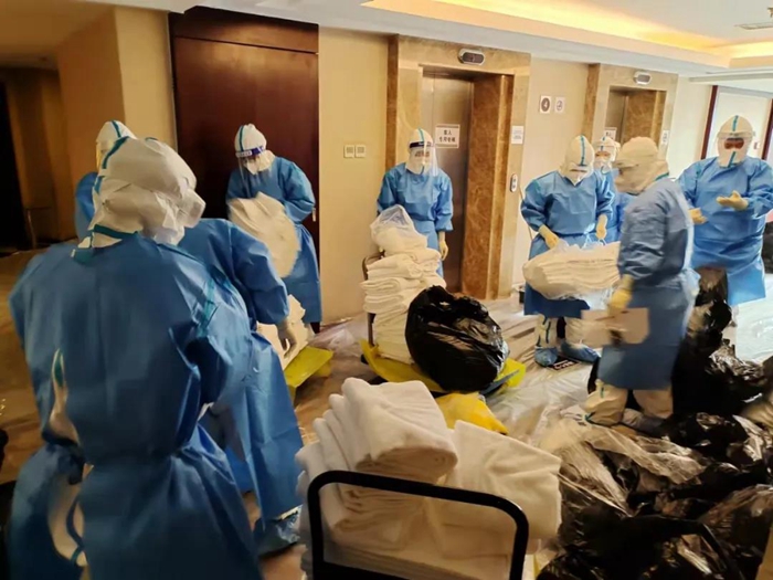 困難和挑戰(zhàn)首先體現(xiàn)在前臺入住、離店手續(xù)、客房清潔的工作流程的較大變化上。前臺每次接到指揮部通知即將有新隔離人員入住或隔離人員解除隔離時,他們都需要全副武裝穿上防護服在前臺等候。每天都有隔離人員解除隔離,離開酒店后,消殺組會對客房、公共區(qū)域進行全面消毒。客房服務(wù)組在隔離人員退房后,對所有隔離人員使用的物品嚴格按照感染性廢物進行處理,處理完畢后重新打掃恢復(fù)房間使用,這對于從未從事過醫(yī)療行業(yè)的員工來講,是一種全新挑戰(zhàn),在接受了醫(yī)護人員的緊急培訓(xùn)后,他們嚴格履行操作流程,對100多個房間進行了打掃翻房處理,保證了后續(xù)隔離觀察人員的順利入住。