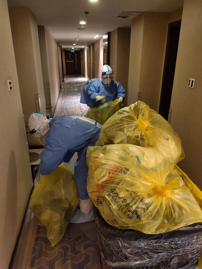 在長達14個日日夜夜的堅守中,隔離區(qū)服務(wù)保障組14名骨干建造了一個“臨時的家”。連日來,他們“逆行”奔赴防疫前沿崗位,他們勇敢堅守,承擔(dān)隔離區(qū)服務(wù)保障重任。14天里為了避免交叉感染,保證人員隔離期間的食品安全,他們配送了5886份餐食。每日夜里0:00至凌晨02:00進行集中隔離區(qū)產(chǎn)生的醫(yī)療垃圾和生活垃圾的收撿工作,14天約產(chǎn)生近10860公斤的醫(yī)療垃圾廢物,收撿后運輸?shù)綄S美娣盘帲▽I(yè)垃圾房),進行全方位消殺。