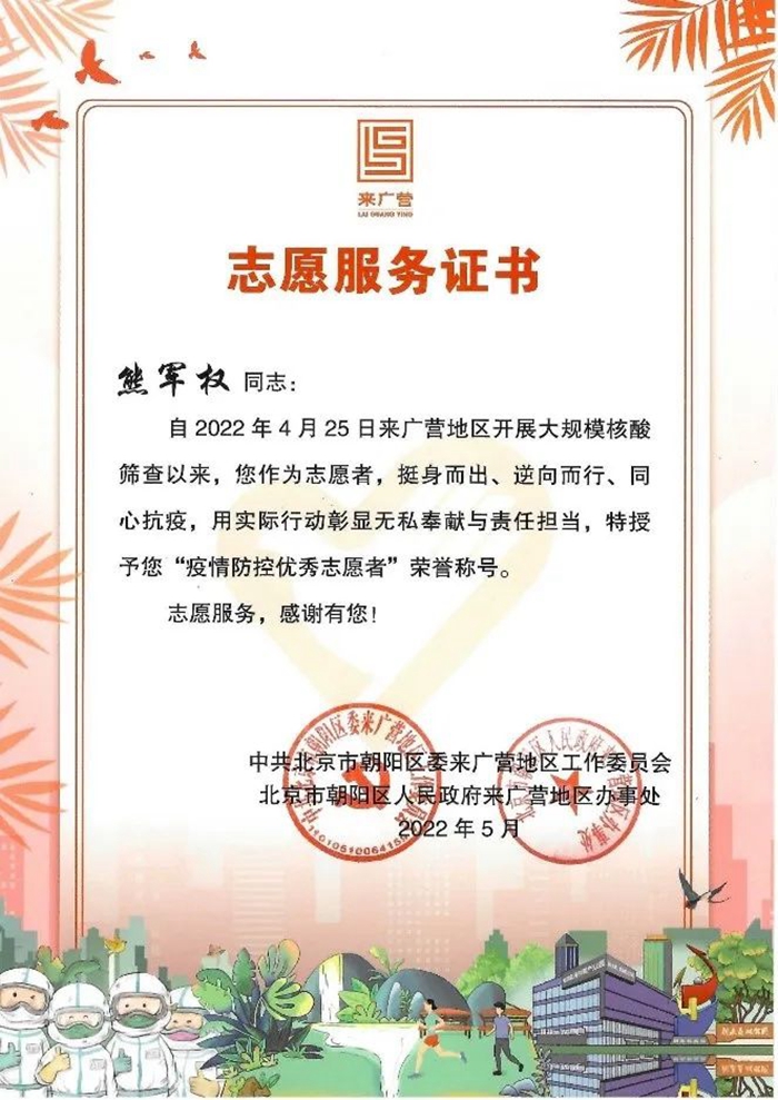 我真心地感謝北京化工集團(tuán)、華騰東光公司領(lǐng)導(dǎo)給予了我這樣一次難得的、意義深遠(yuǎn)的志愿服務(wù)機(jī)會(huì),公司黨總支、工會(huì)還給我送來了慰問和溫暖。如果再有這樣的機(jī)會(huì),我依然會(huì)積極去服務(wù),盡自己的努力為身邊的人做一些力所能及的事。我志愿,我快樂,請(qǐng)組織放心,請(qǐng)領(lǐng)導(dǎo)放心,為了北京的平安,為了社區(qū)的平安,作為國企職工,我一定堅(jiān)持到底,戰(zhàn)斗到底,直到北京全面清零,共創(chuàng)我們的美好家園。