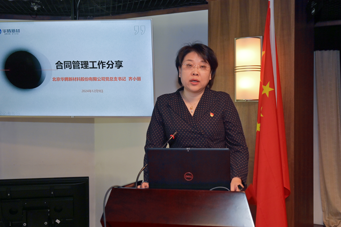 化研院黨總支書(shū)記助理李志勇圍繞制度體系建設(shè)和內(nèi)控合規(guī)工作,華騰新材黨總支書(shū)記齊小麗圍繞合同管理分別作交流發(fā)言。
