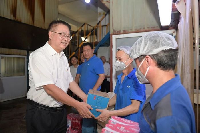 7月9日下午,北京化工集團黨委書記、董事長陳宇,黨委副書記吳瑞峰,黨委常委、副總經理韓寶海,黨委常委、紀委書記常延輝來到華騰橡塑,進車間、到班組,親手將一份份清涼飲品送到一線職工手中。慰問過程中,陳宇詳細了解一線職工工作生活情況,對大家冒著高溫酷暑,以高度的責任感和飽滿的工作熱情堅守一線給予充分肯定。陳宇叮囑大家既要高質量完成好本職工作,又要時刻關注身心健康,集團各級黨組織和工會組織要從各方面確保防暑降溫工作落到實處,保證干部職工健康安全。
