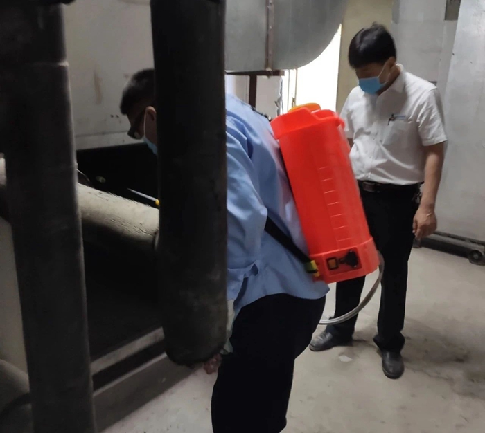 工作人員對(duì)華騰新天地商場(chǎng)新風(fēng)機(jī)組進(jìn)行消殺作業(yè)