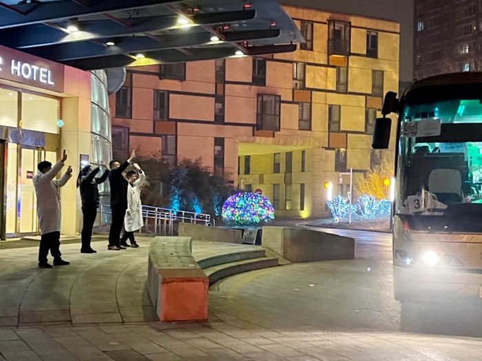 2月12日大年初一夜里,正當(dāng)人們闔家團(tuán)聚喜迎新春之時(shí),華騰美居酒店干部員工卻以“歡送”的方式迎接這一喜慶時(shí)刻的到來。此時(shí)的華騰美居酒店大堂門前,北化房地產(chǎn)公司黨總支委員、副總經(jīng)理、美居酒店負(fù)責(zé)人白江正與酒店管理人員一起守候在門口,向魚貫而出的人們揮手告別,目送他們踏上回家的大巴車。同樣的一幕在次日的大年初二夜里再次上演。至此,262名隔離人員在華騰美居酒店完成21天隔離觀察,并經(jīng)核酸檢測為陰性后,于2月12、13日大年初一和初二夜里,分兩批全部踏上了返家的路途。