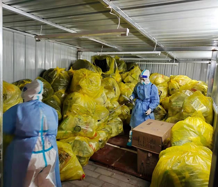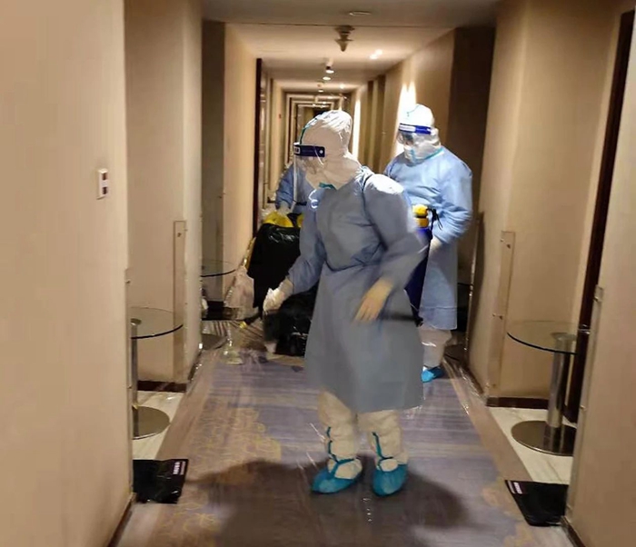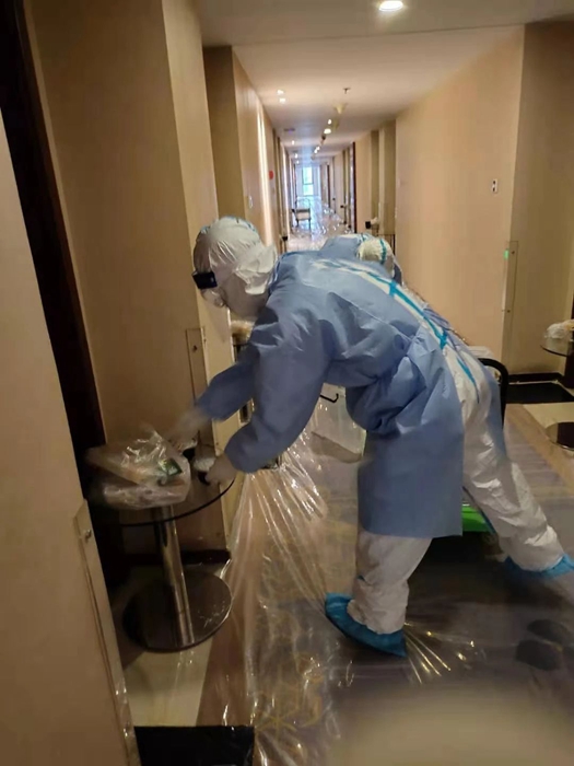 從收到通知到隔離人員全部返家的23天里,共產(chǎn)黨員、酒店負(fù)責(zé)人白江一直在酒店 “坐陣指揮”,最快速解決面臨的各種問題。7名隔離區(qū)消殺組成員每日24時(shí)至凌晨3時(shí)進(jìn)行垃圾收撿,每日晚餐后還要對公共區(qū)域進(jìn)行全方位消殺,對每天產(chǎn)生的800多公斤醫(yī)療垃圾廢物,收撿后運(yùn)輸?shù)綄S美娣盘帲M(jìn)行全方位消殺。