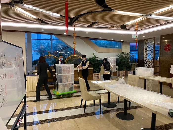 一場按照隔離服務(wù)標(biāo)準(zhǔn)進(jìn)行酒店改造的大會(huì)戰(zhàn)隨即打響。從酒店區(qū)域劃分到人員分配培訓(xùn),從制定用餐標(biāo)準(zhǔn)到采購所需物資,從接待程序到后勤保障……在領(lǐng)導(dǎo)小組的直接指揮下,每一項(xiàng)工作逐一明確責(zé)任,每一項(xiàng)細(xì)分事項(xiàng)逐一落實(shí)到人、到物……一場涉及全酒店的系統(tǒng)改造工程就在這緊張忙碌,卻不失有序的氛圍中全面鋪開,從艷陽高照到日薄西山,從華燈初上到到夜深人靜……酒店全體員工通宵投入到改造中,華騰美居酒店迎來了一個(gè)不眠之夜。